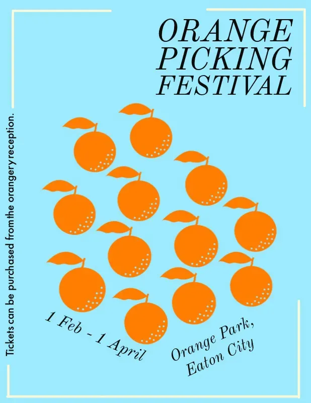 These digital image selections are suitable for infographics, modern designs, minimalist designs, repetition, and creating patterns. As you’re organizing an Orange Picking Festival that hasn’t happened yet, perhaps you don’t have any photos to use. To convey messaging and give imagery, icons and graphics can be employed. Icons can be resized and changed in color to fit the style of your flyer design. Check out the detailed guide about flyer size.