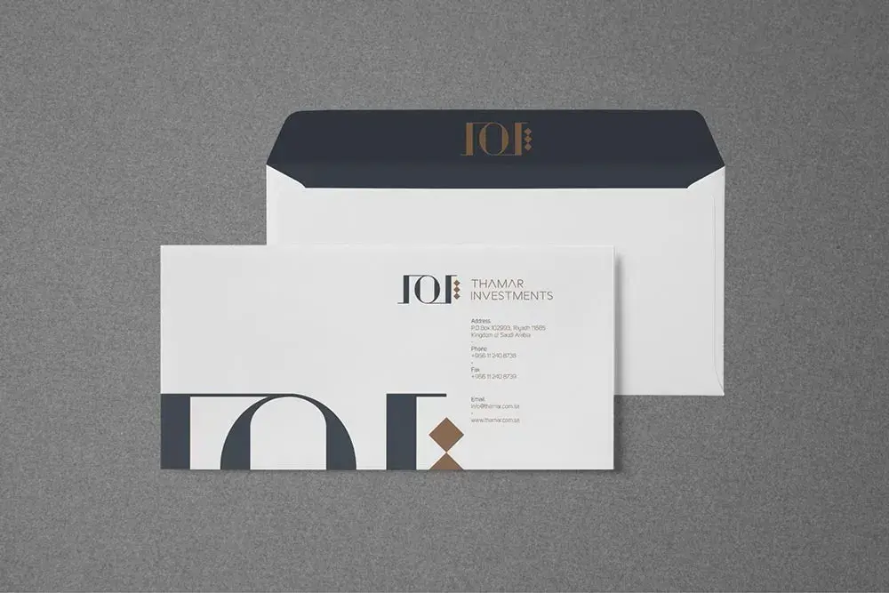 As demonstrated in this piece created for Thamar Investments, portions of the logo may protrude beyond the edge of the page. Check out some modern logo design ideas.