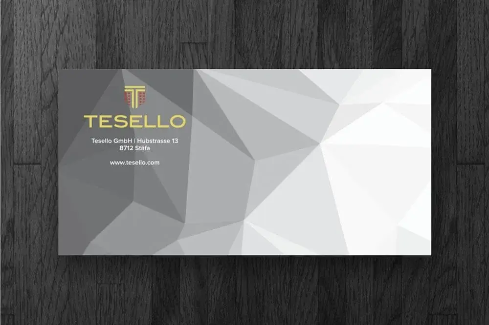 To give the envelope design for Tesello GmbH a distinctive appearance, it uses an abstract geometric pattern that mimics a gemstone or geographical map.