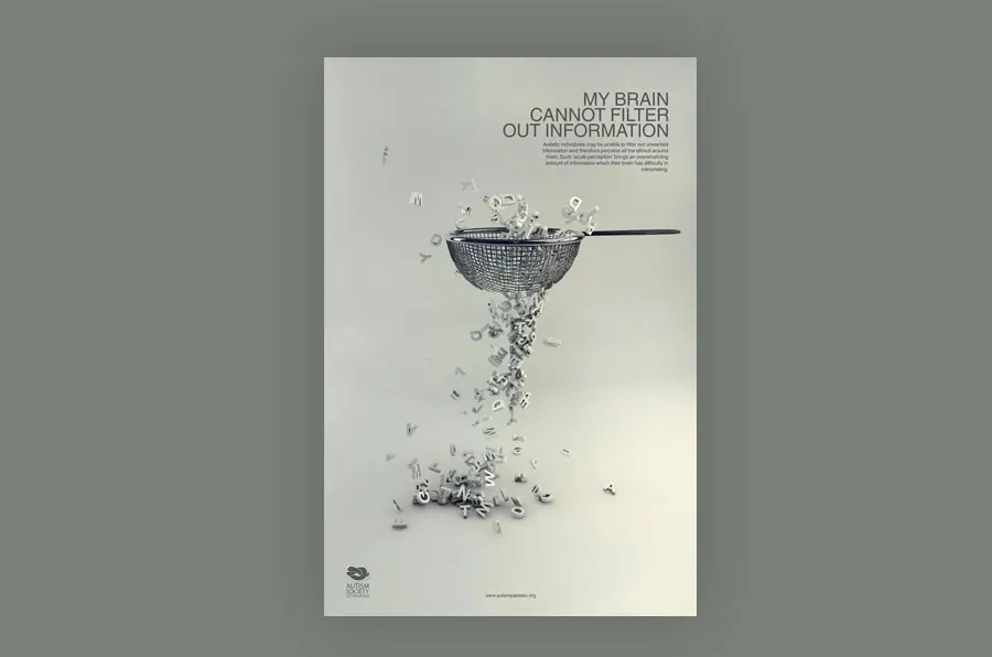 A good example is this poster design for Autism by the Autism Society of Pakistan. Firstly, the leading lines of the text pop out, minimal colors, the design matches the idea, and there is enough open space for the attention to go to the information directly. Check out the essential elements of graphic design poster.