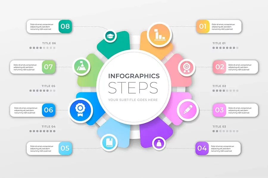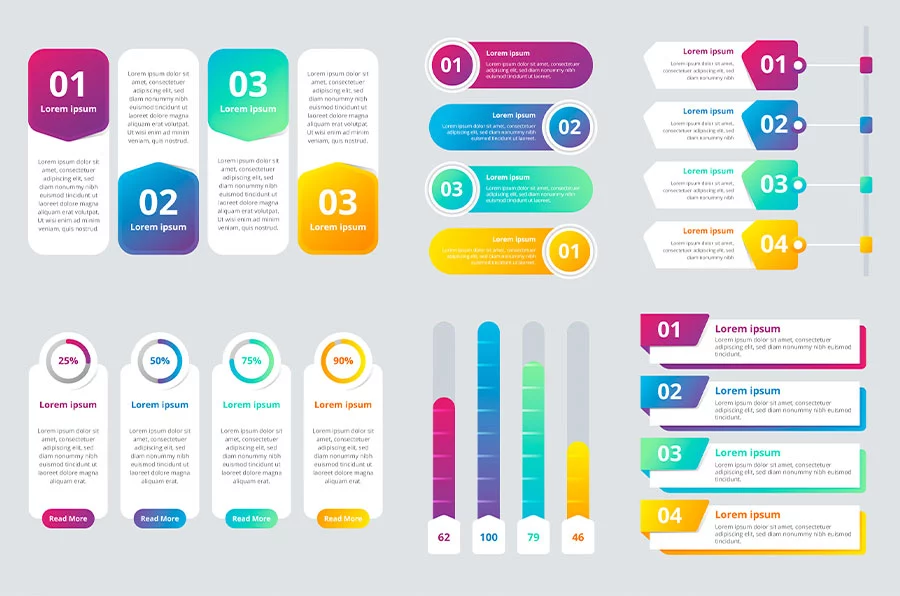 For an informational infographic, heavy importance is put up on the text. For a process infographic, list infographic, and resume infographic.