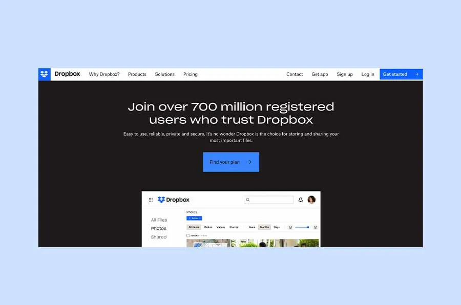 Dropbox is an American file hosting service that can help you store and share files, collaborate on projects, and save files for your future use. The homepage has two compelling CTAs – “Get Started” and “Sign up for Free” with a clear, data-backed marketing copy.