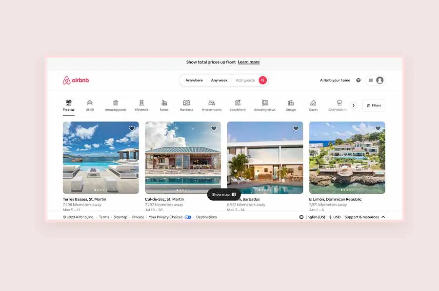The homepage goes straight to the point by instantly bringing up vacation home ideas for different countries and decors. It includes prices, a search button at the top, an interactive map, a sign-in hamburger menu, and a CTA -“Learn more” at the top. Web visitors can access many options as they scroll down the page. In our opinion, this page has all the information every traveller needs.
