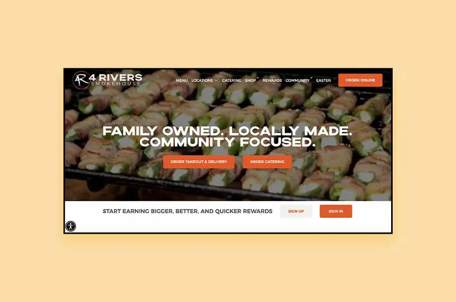 4 Rivers Smokehouse is an award-winning, family-owned BBQ restaurant that offers the best slow-smoked barbecue – brisket, chicken, and pork – to customers in Florida and Georgia. Being a restaurant website, it is not surprising that the first thing you see on this page is the parallel scrolling guides with a tour of their service, menu, and people, as well as meal preparation and yummy-looking food photography.