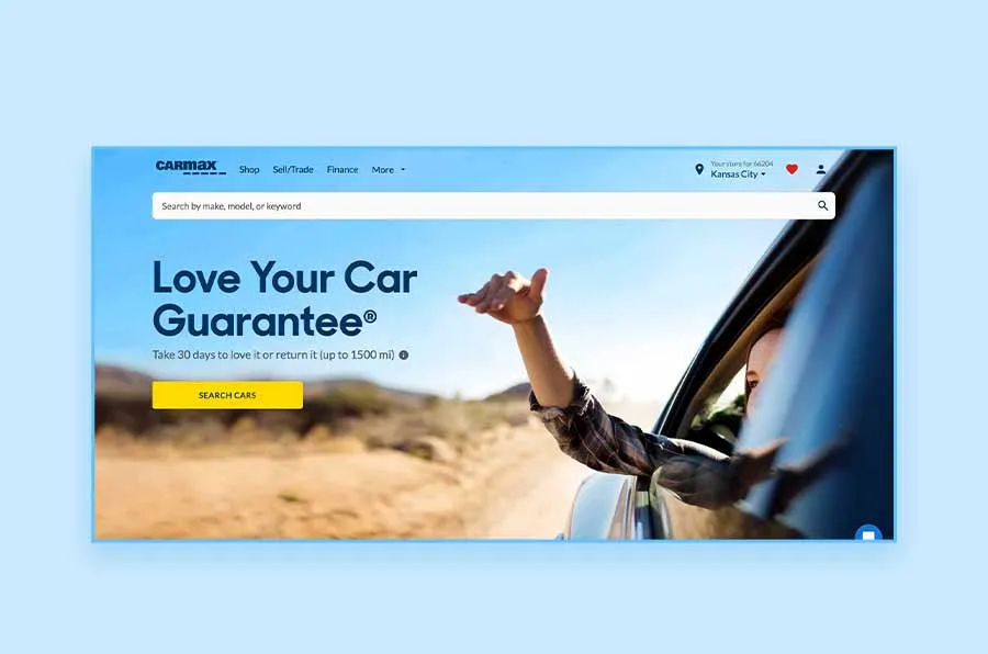 CarMax is a US-based used vehicle retailer with an inventory of 40,000 vehicles. They specialize in buying and selling used cars. The homepage has a wide-frame image background with a search bar, a compelling headline, and sub-headlines with a CTA – “Search cars.”