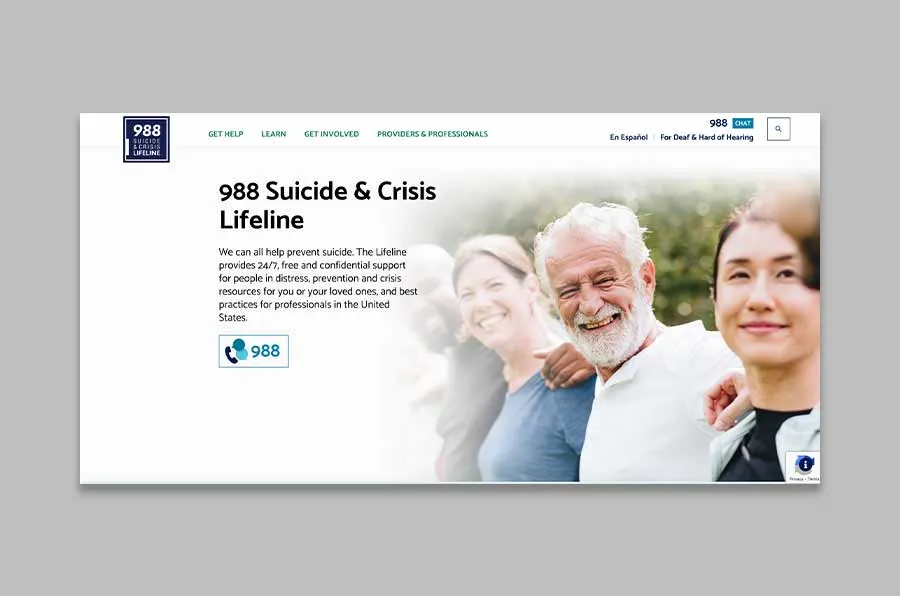988 Suicide & Crisis Lifeline is a suicide prevention organization that offers help to people who want to commit suicide. Its homepage design is simple and easy to understand. It has the company name as the headline with a copy and a CTA to encourage users to call. It is designed to help people find information and help very easily.