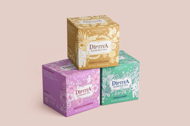 Each box features a hand-drawn pattern that honors the ingredients and draws design cues from Sri Lankan traditional dress, tropical vegetation, and animal life.