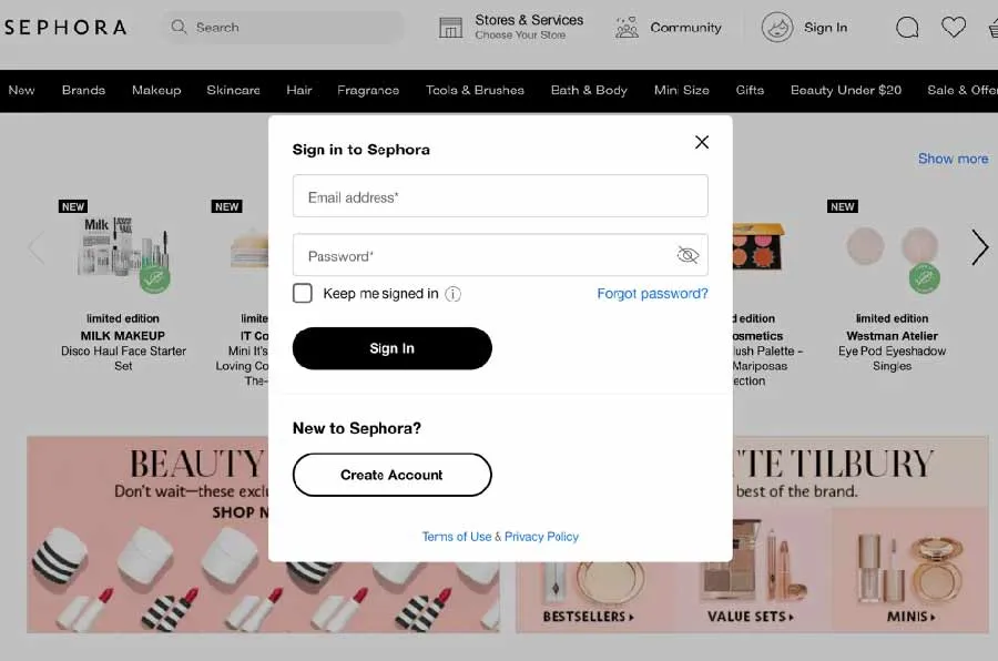 Sephora is a beauty brand with a presence in many countries around the world. It uses a modal window for its login page design and effectively uses different visual elements to differentiate between the login and sign-up pages.