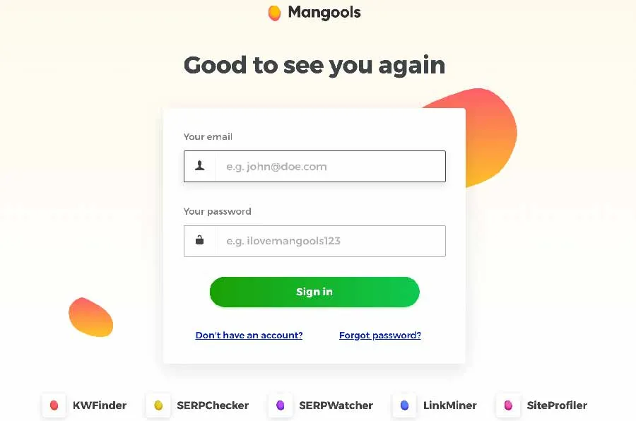 Mangools is a package of easy-to-use SEO tools with a great design that works for bloggers, affiliate marketers, marketing agencies, and SEO professionals. The login is predominantly white, but still has a pop of neon orange colors.