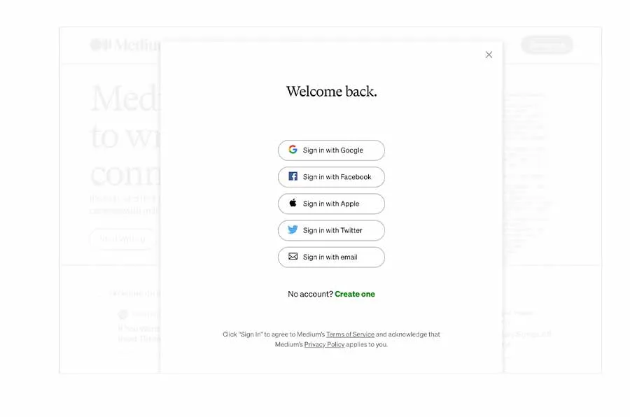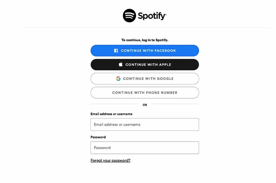 Like Medium, Spotify’s website login page also gives users the option to log in with Facebook, Apple, Google, or mobile phone number.