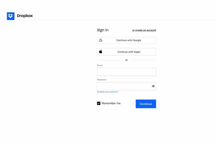 Dropbox is a file hosting service that offers cloud storage, file synchronization, and personal cloud and client software, headquartered in San Francisco, California, U.S. The login form is located at the center of the homepage.