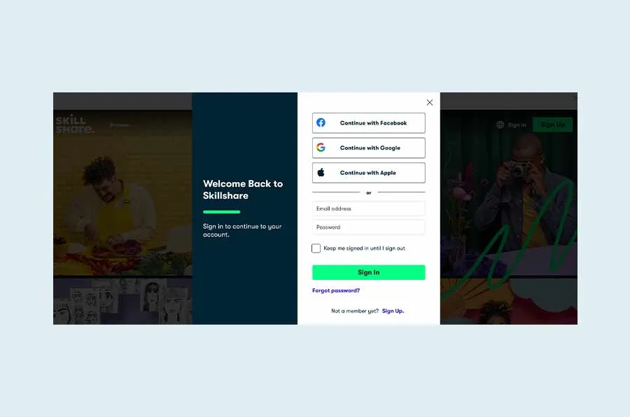 First is to enter the email address and follow the due process or just use social media accounts to log in. The sign-in form is simple and has the majority of the content at the center of the stage.