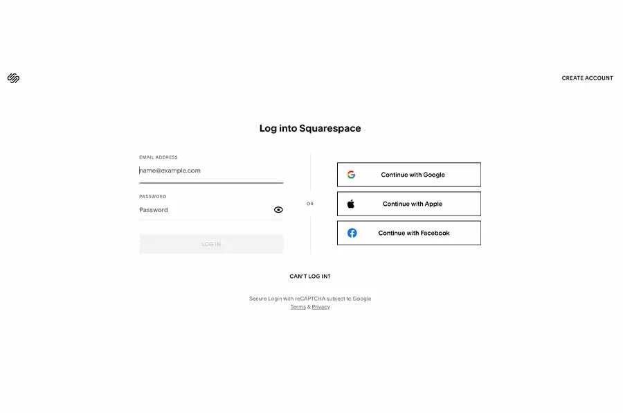Squarespace login form has a minimalist design with social login buttons that makes it easy for users to sign in without frustration.
