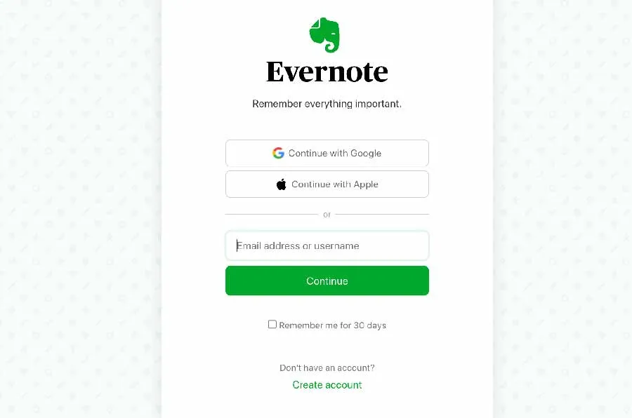 Evernote is a note-taking and task management application designed for archiving and creating notes where photos, audio, and saved web content can be embedded. It has a simple login form with fewer color distractions or animation.