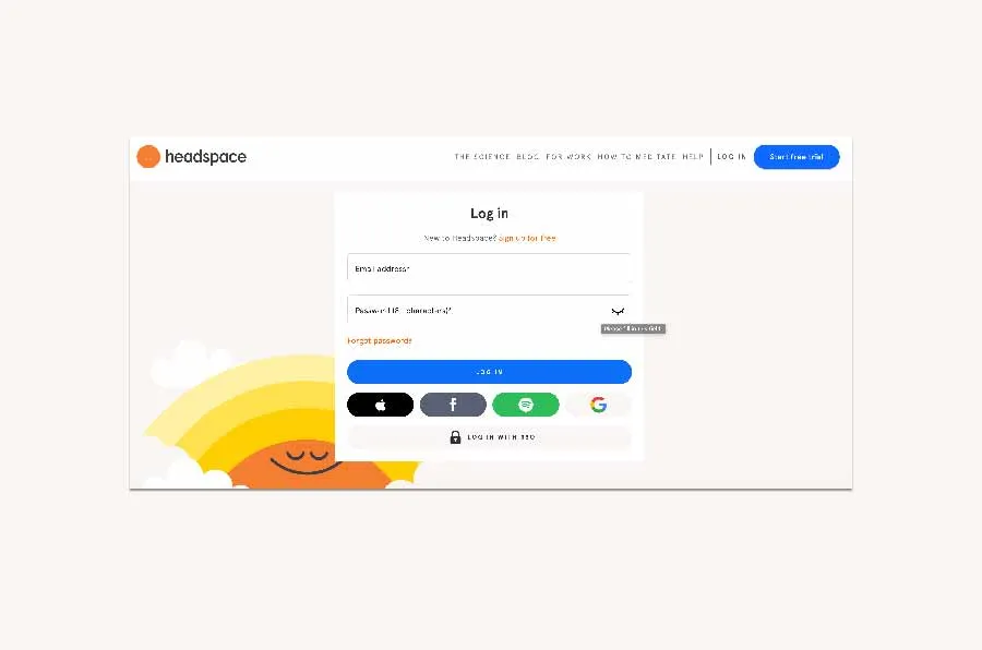 Headspace is an English-American online meditation service. Their login form has a minimalist design with muted colors with well-constructed and spacious type and composition of the design elements.