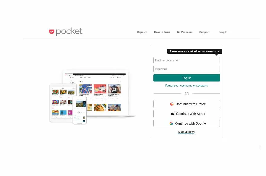 Pocket is a web and mobile app that allows users to save content to read later offline. It has a split-screen design with various options for logging in.