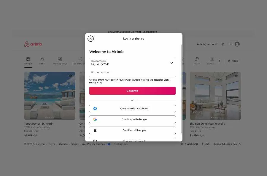 The login page form allows users to sign in with Email, Facebook, Google, or Apple which are most popular with typical Airbnb users.