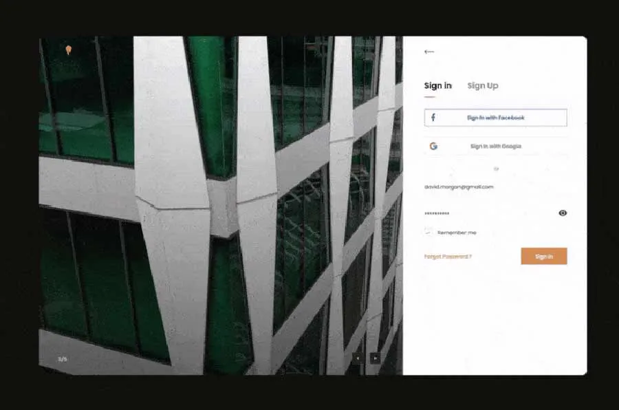 Gapsy Studio designed this real estate sign-in form with social login and the option to unmask the password and allow the website to remember the user.