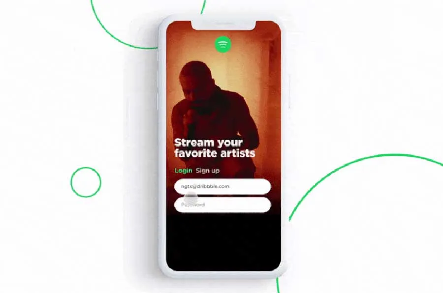NGTS designed this Spotify login design with a vibrant login form based on the original brand. It has a cool background video design, with a simple form and a Login sign-in tab bar.